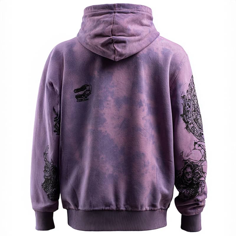 This custom hoodie blends gothic architectural imagery with a washed purple tie-dye base, creating a moody, atmospheric aesthetic. The soft gradients of violet and mauve evoke twilight skies, while the fine-line cathedral sketch at the front and mysterious dark ink-like motifs on the back and sleeves add depth and story. The design feels almost spiritual — as if the garment captures a sacred moment between decay and divinity. Perfect for those who embrace poetic darkness and elevated streetwear, this piece is a wearable relic of modern gothic elegance.