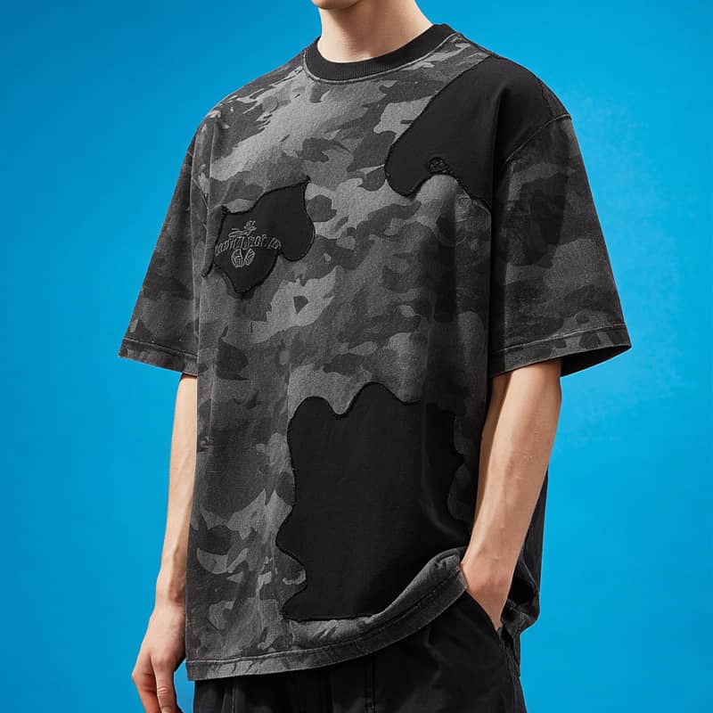 Custom Camouflage Patchwork T-Shirt – Black & Grey