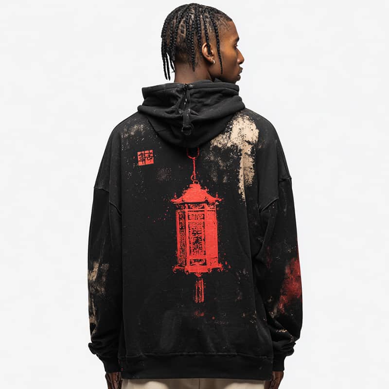 This custom hoodie draws from traditional Chinese aesthetics, blending iconic elements like the red lantern with urban street art. The bold red ink splashes and distressed textures convey the dynamic contrast between ancient symbols and modern fashion. The oversized design paired with the fragmented, graffiti-style print captures a sense of rebellion, while the classic red lantern imagery pays homage to cultural heritage. This hoodie is for those who appreciate the intersection of traditional art and contemporary street style, making a statement through color, design, and cultural fusion.