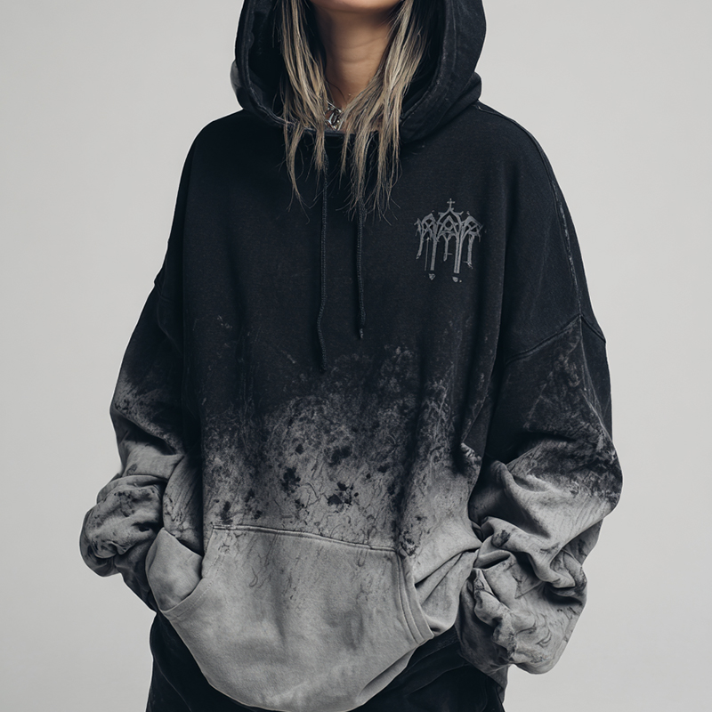 This custom hoodie captures a minimalist, yet striking aesthetic with its gradient dye from deep black to grey, creating a moody, artistic vibe. The unique bead-like embellishments on the back resemble drips or stalactites, adding a touch of elegance and texture. The combination of faded colors and subtle detailing creates a sophisticated, deconstructed look that is both streetwear and high fashion. It’s perfect for those who appreciate understated design with a touch of edgy sophistication, offering a perfect balance between art and fashion.