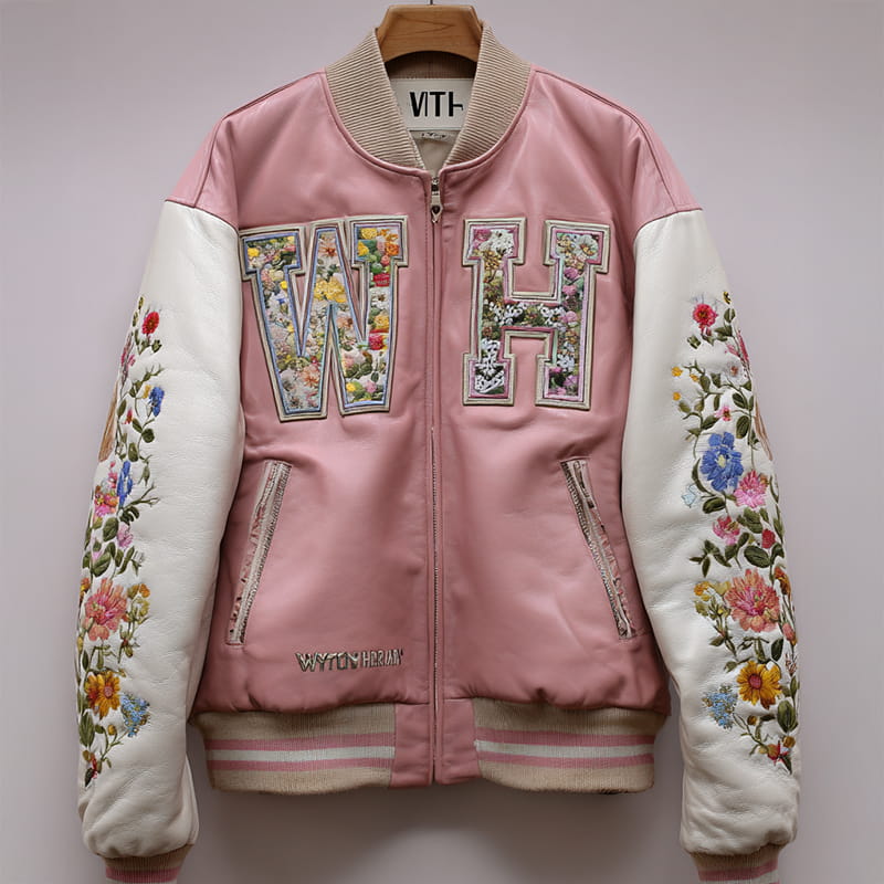This custom varsity jacket fuses romantic florals with classic streetwear, transforming a traditional bomber silhouette into a canvas of delicate craftsmanship. The soft pink body contrasts with ivory sleeves richly embroidered with blooming flowers, symbolizing vitality and elegance. On the front, varsity-style “WH” patches filled with floral motifs add a playful twist, while the back becomes a storytelling surface with layered embroidery, patchwork hearts, and handwritten-style lettering.